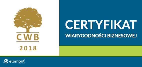 Wyróżnienie za rok 2018 przyznane Elemont CERTYFIKAT WIARYGODNOŚCI BIZNESOWEJ Bisnode Certyfikat Wiarygodności Biznesowej to prestiżowe wyróżnienie, które jest nadawane firmom o najwyższej i wysokiej ocenie stabilności wystawianej według danych Bisnode Polska. Wyróżnieni Certyfikatem to firmy o danych finansowych dających gwarancję na wysoki poziom rentowności, zdolności i płynności finansowej, których poziom zadłużenia oraz zarejestrowanych przeterminowanych płatności jest znikomy. Tylko 1% firm na rynku znajduje się w elitarnym gronie wyróżnionych […]
